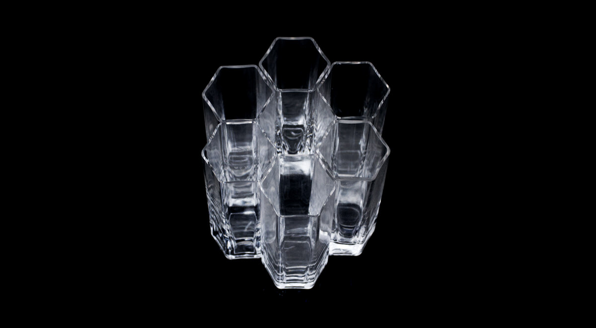 similar to a Tom Collin sized glass, is intended to be used in clubs and events. The exagonal shape reflects the shape of the logo.